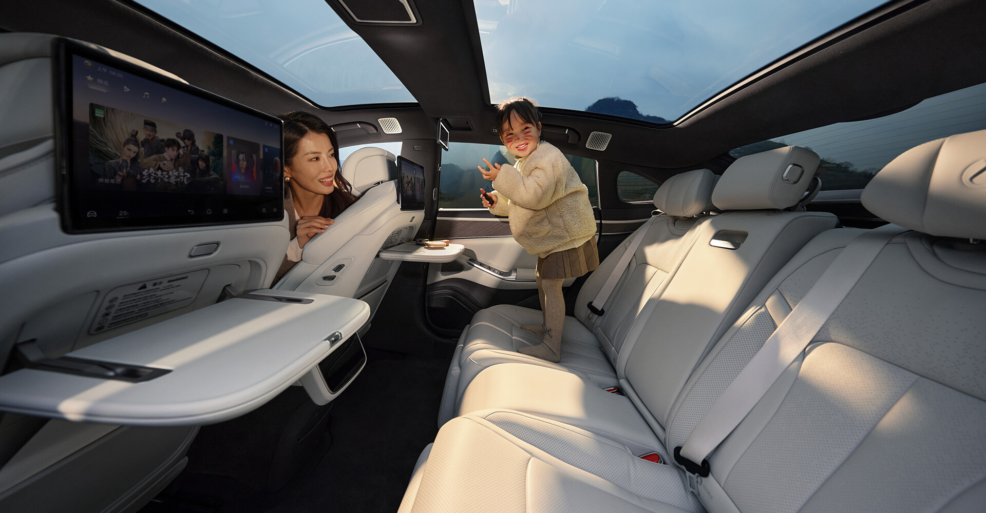·12.8英寸双智能头枕屏 ·7英寸智能扶手屏 ·后排双柔光化妆镜 ·后排双桌板